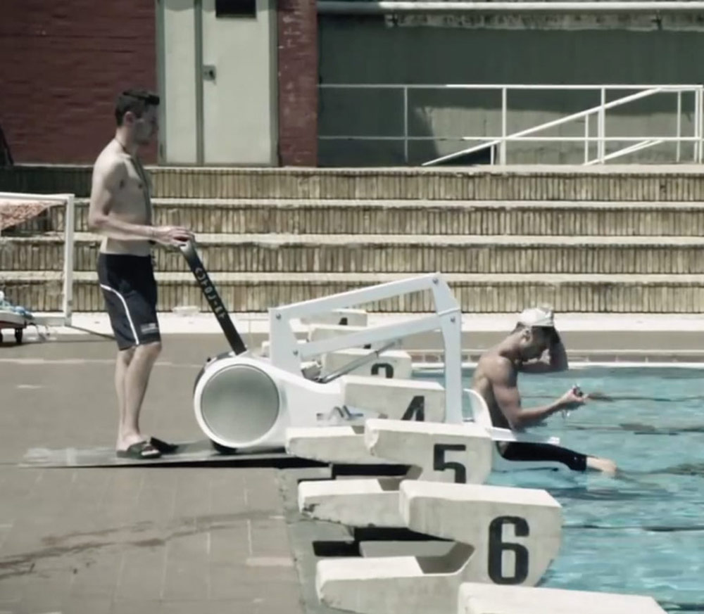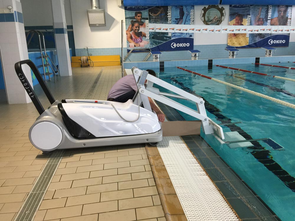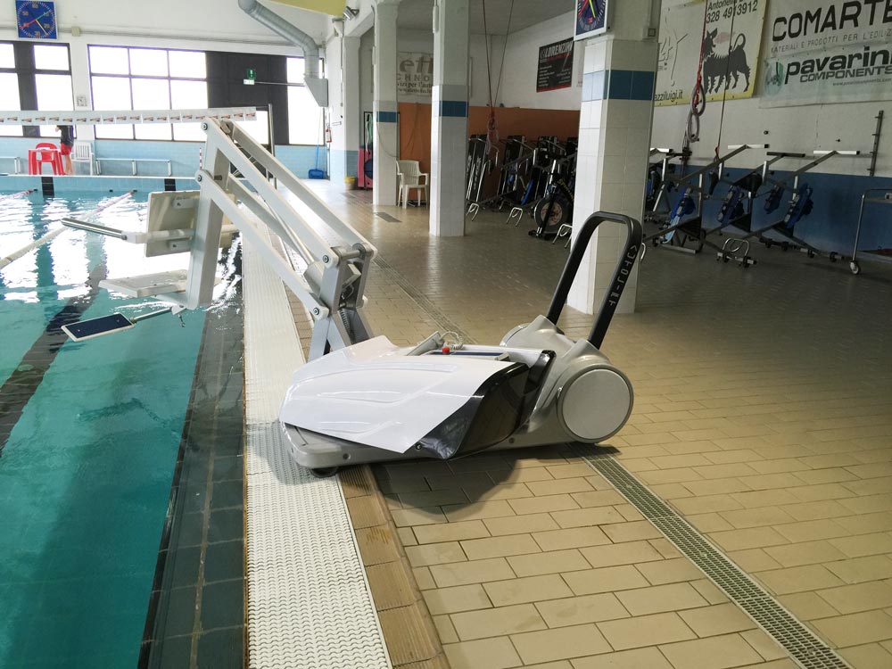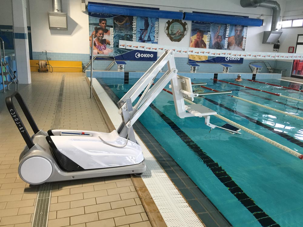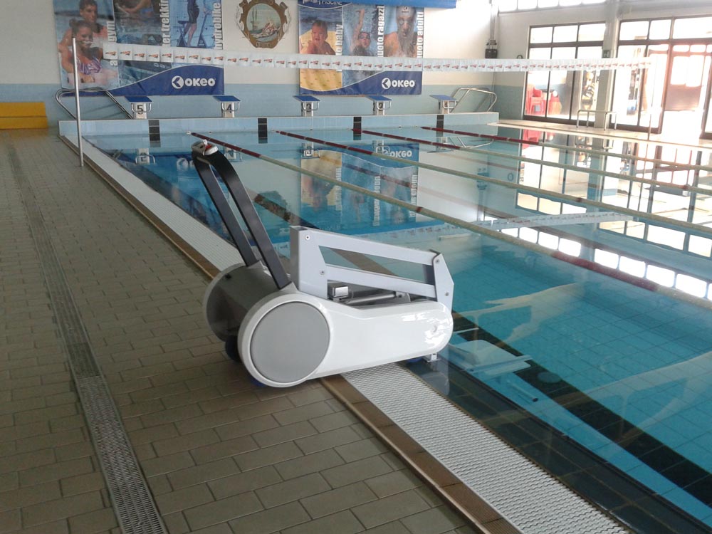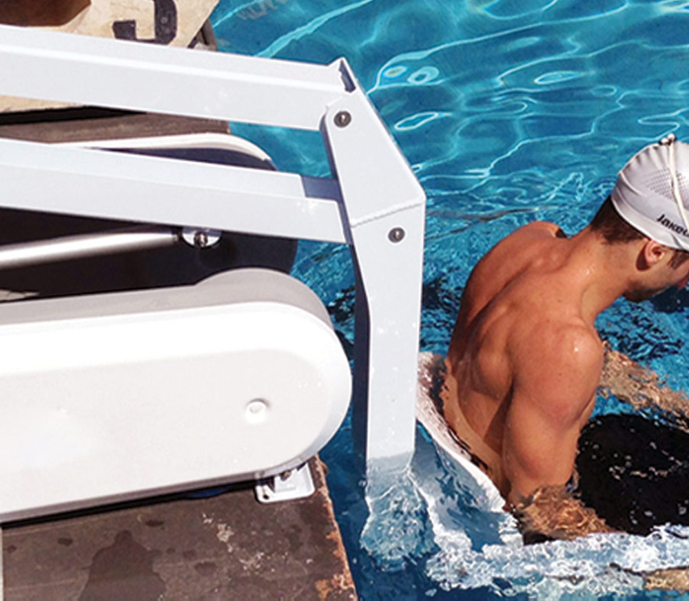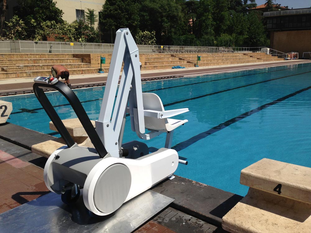 Elevador de piscina móvel. Solução estética e portátil, fácil de manusear. O utilizador é comodamente levado até ao rebordo da piscina para entrar dentro de água. Funciona a baterias. Dispensa as habituais fixações. Capacidade de carga 110 Kg.
