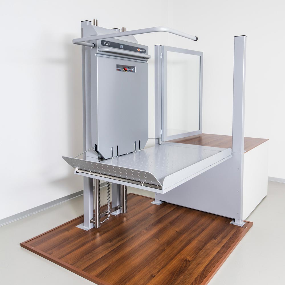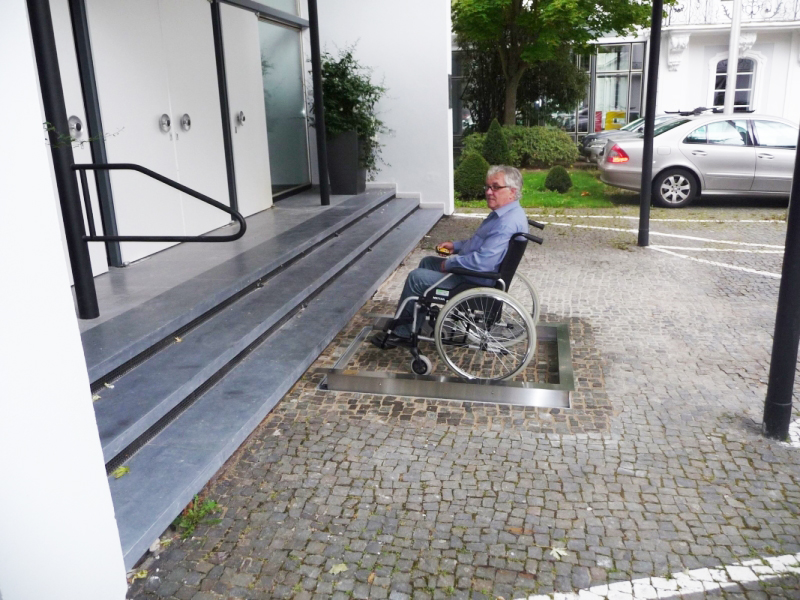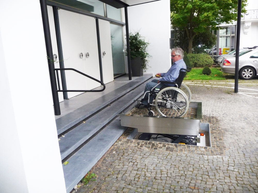 A plataforma elevador Angular fica encastrada e alinhada com o pavimento podendo por opção ser transponível de carro quando a mesma está fechada.