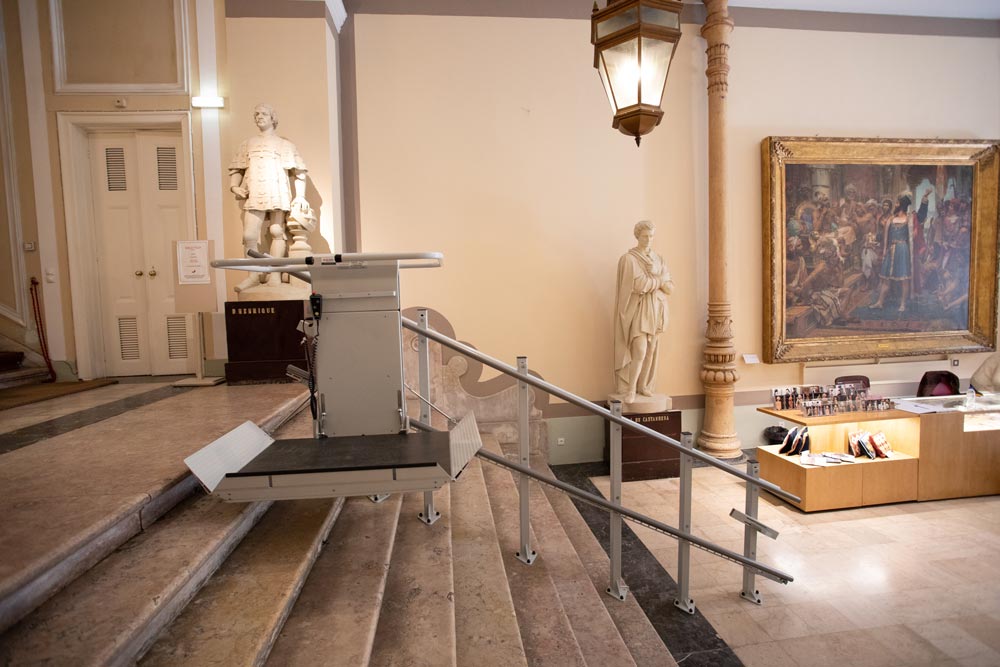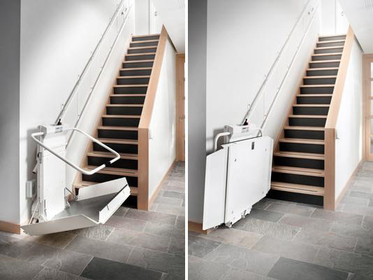 A plataforma pode ser equipada com um assento pelo que, num abrir e fechar de olhos, pode ser transformada numa cadeira elevador de escada.