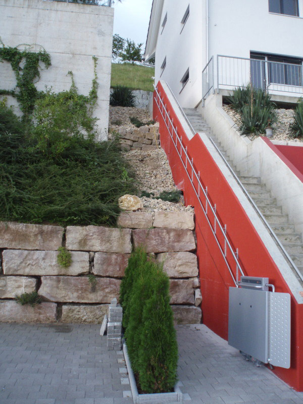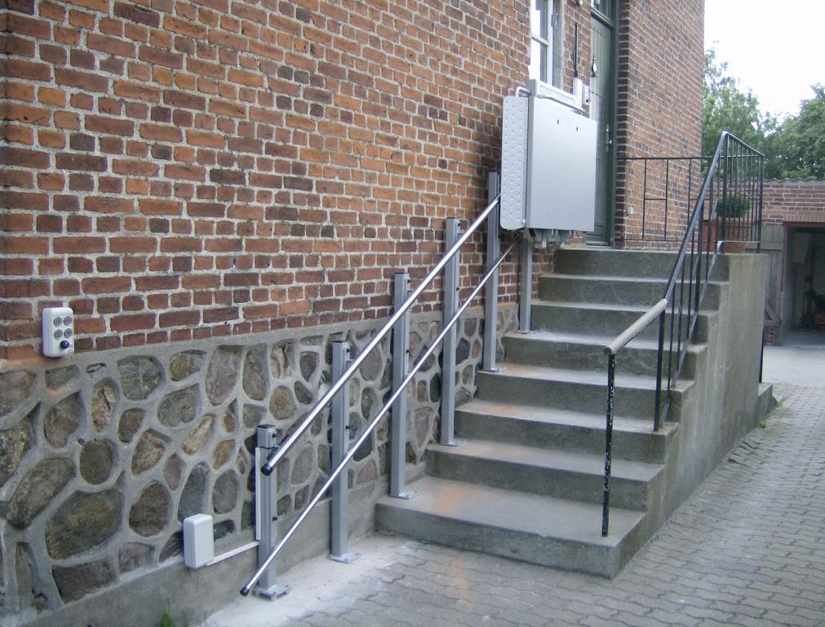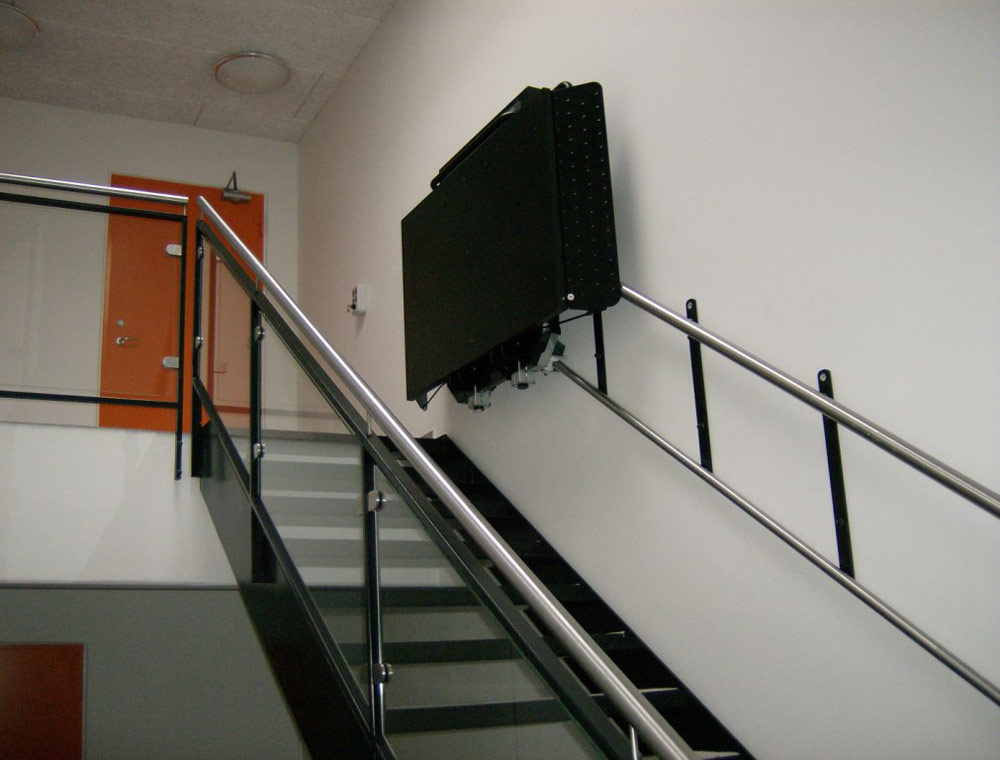 Com sistema de duplo rail fixo directamente à parede ou aos degraus mediante suportes verticais, a sua guia superior em aço inox pode assumir a função de corrimão na escada, dado que é isenta de quaisquer resíduos lubrificantes e sujidades.
