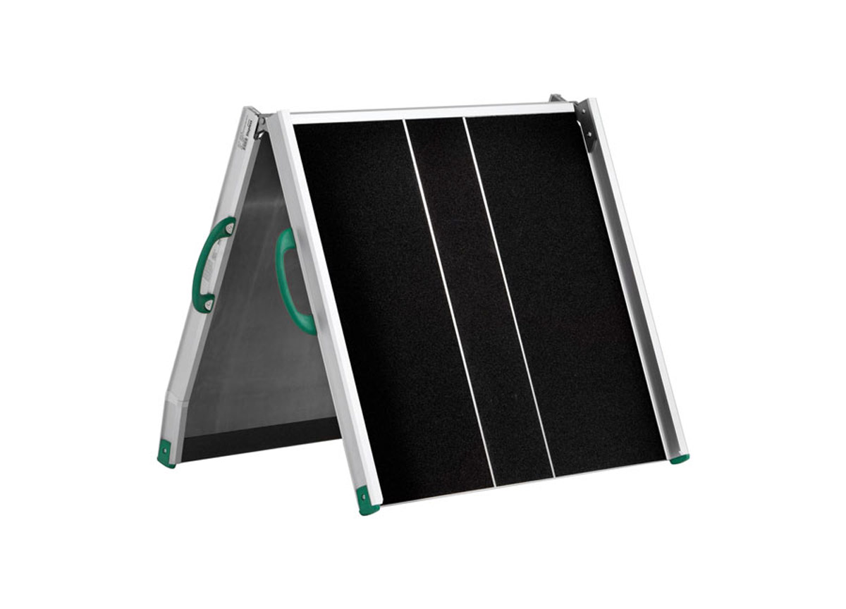 Este modelo de rampa ocupa menos espaço quando não está em uso, pois pode ser dobrado ao meio.